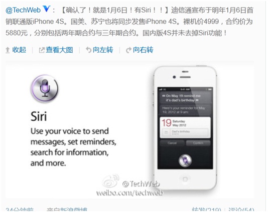 The China edition iPhone 4S will be put on sale on 6th, January with Siri maintained, as stated in Weibo by Techweb, a Chinese IT media. The price of the device will be the same as the that of iPhone 4 when put on sale, 4999 yuan ($ 792) of the device only and 5880 yuan ($932) of the contract price, which has the contract of 2 years or 3 years. And one thing shall be noticeable that the Siri is maintained.